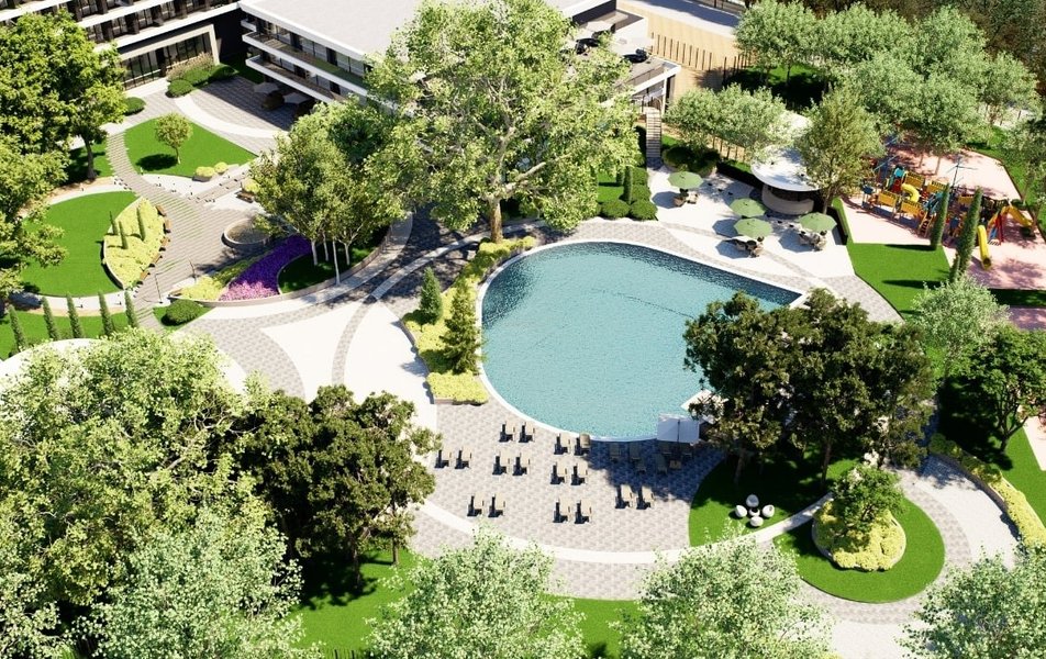- пользование открытым бассейном с выделенной детской зоной с теневыми навесами и лежаками