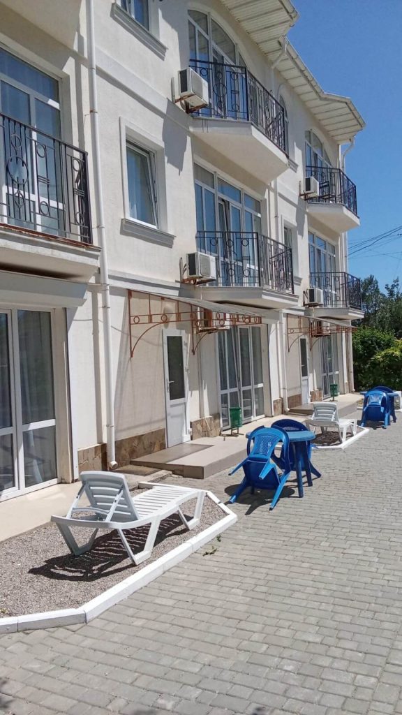 Перед номерами на 1 этаже установлены шезлонги, летние столы и стулья.