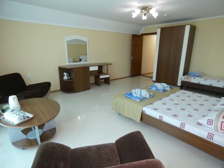 Расположение: гостевой дом находится в курортном поселке Береговое, рядом с Феодосией, недалеко от моря и набережной. Гостевой дом предлагает все необходимое для отдыха:1- и 2-комнатные комфортные номера, кухню, бассейны для взрослых и детей, а также приветливый персонал. Поселок Береговое славится своим пляжем, который называют Золотым из-за цвета песка, пляж очень просторный и считается одним из лучших  песчаных пляжей в Крыму.